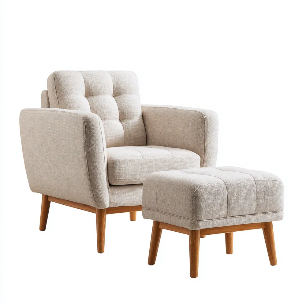 Matériaux et fabricationRecouvert d'un tissu Beige de haute qualité, ce fauteuil repose sur une structure en bois robuste, garantissant durabilité et style intemporel.