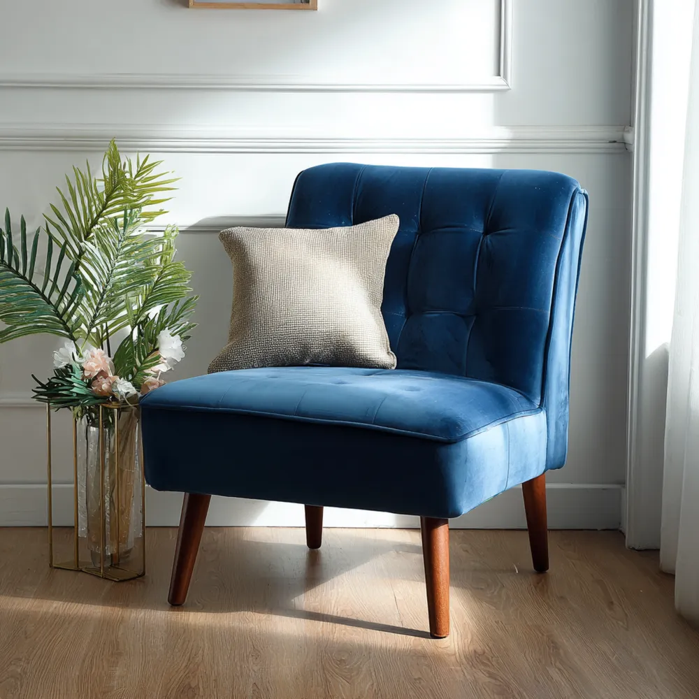 Matériaux et fabricationCe fauteuil est confectionné en velours de haute qualité et repose sur des pieds en bois robuste. Il est disponible en Bleu intemporel.